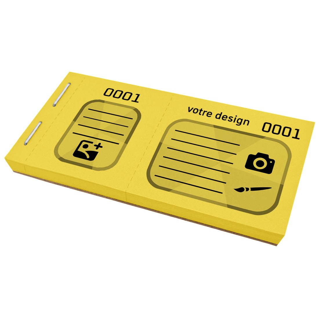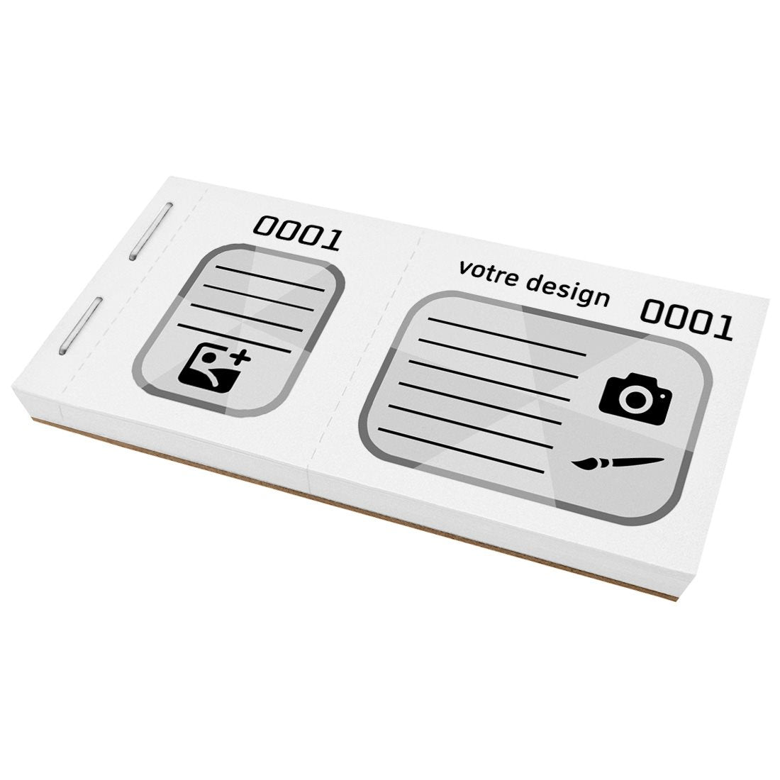 Bloc vendeur numéroté avec carnets avec doubles numéros. Personnalisez ces carnets de tickets avec votre design. Les tickets sont disponibles en carnet de 10, 25 ou 50 tickets. Les numéros commencent à 0001 et se terminent aux doubles numéros que vous commandez. Avec perforation.