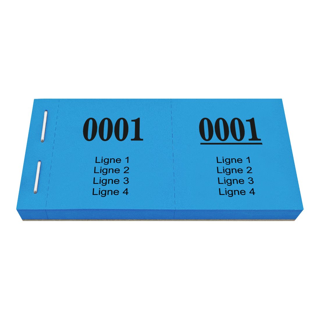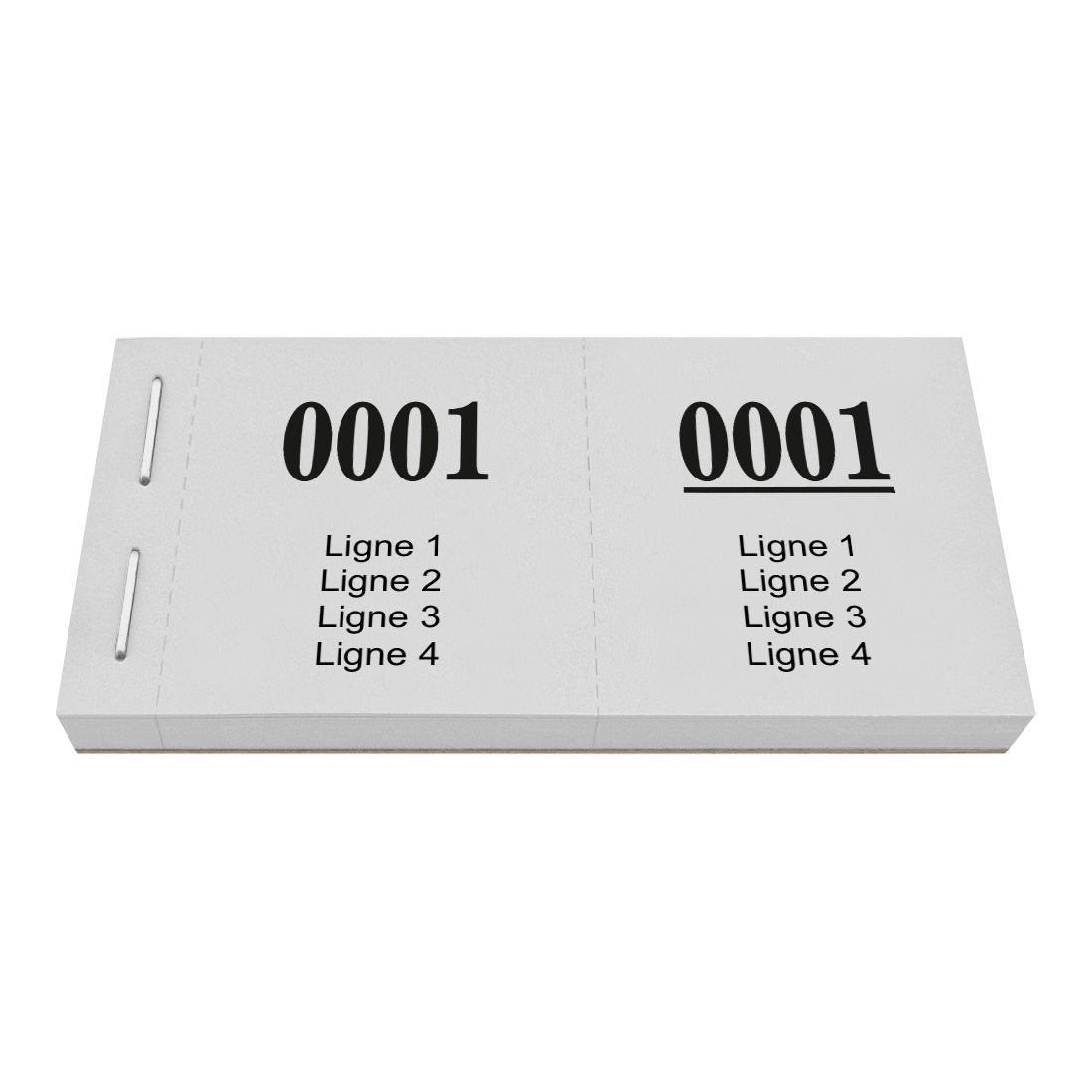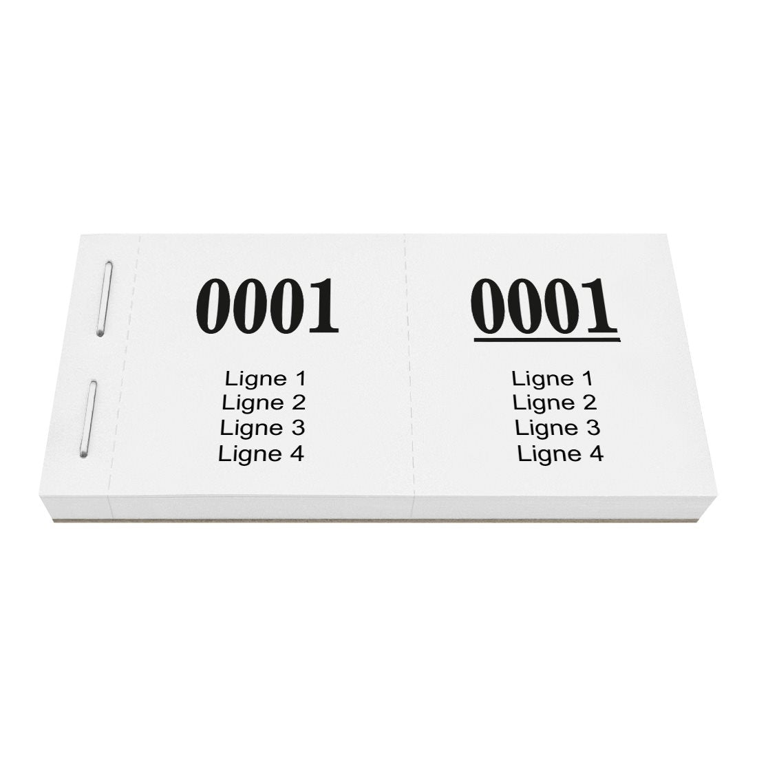 Bloc vendeur numéroté avec carnets de 50 doubles numéros. Personnalisez ces carnets de tickets avec votre texte sur 4 lignes. Pratique pour les loteries, bingo ou tombola. Les numéros commencent à 0001 et se terminent aux doubles numéros que vous commandez. Avec perforation.