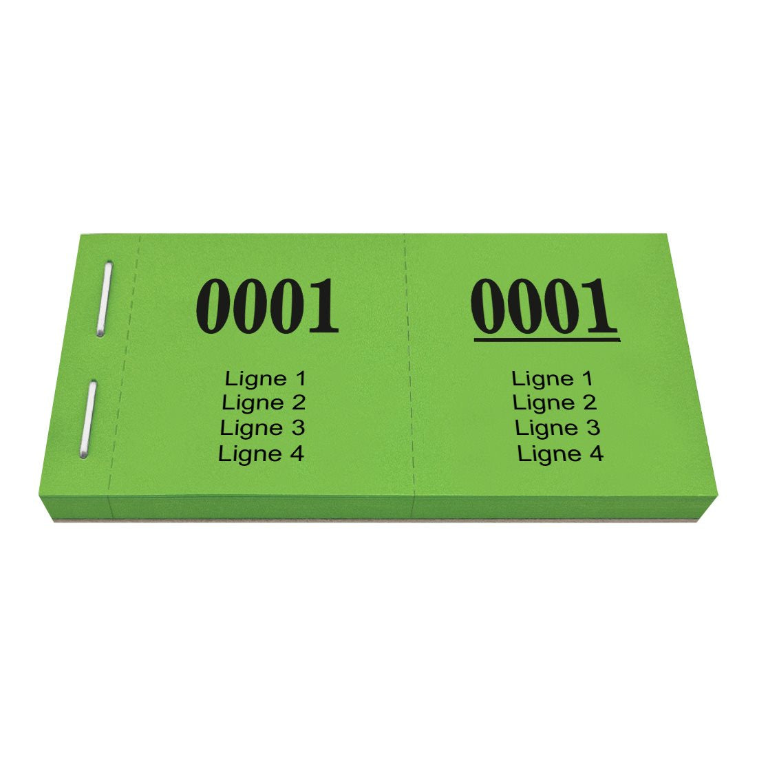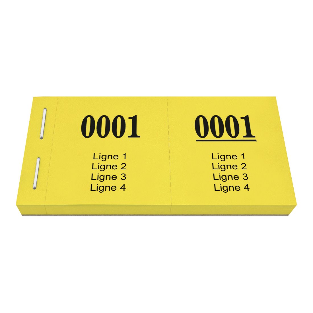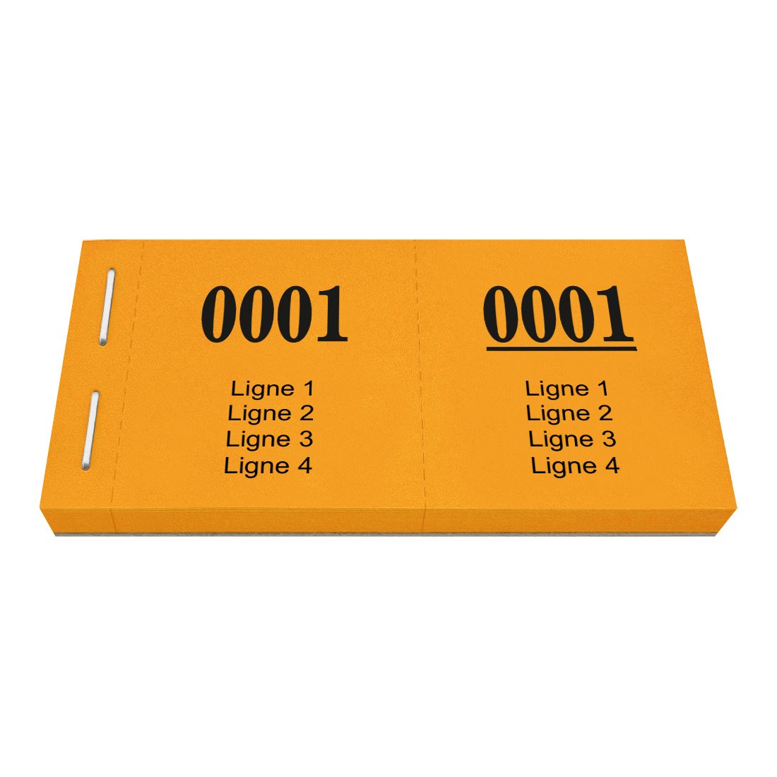 Bloc vendeur numéroté avec carnets de 50 doubles numéros. Personnalisez ces carnets de tickets avec votre texte sur 4 lignes. Pratique pour les loteries, bingo ou tombola. Les numéros commencent à 0001 et se terminent aux doubles numéros que vous commandez. Avec perforation.