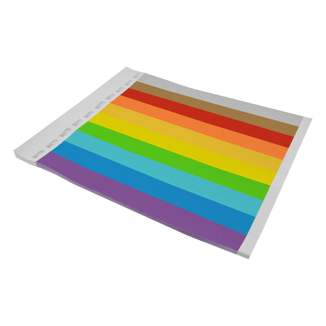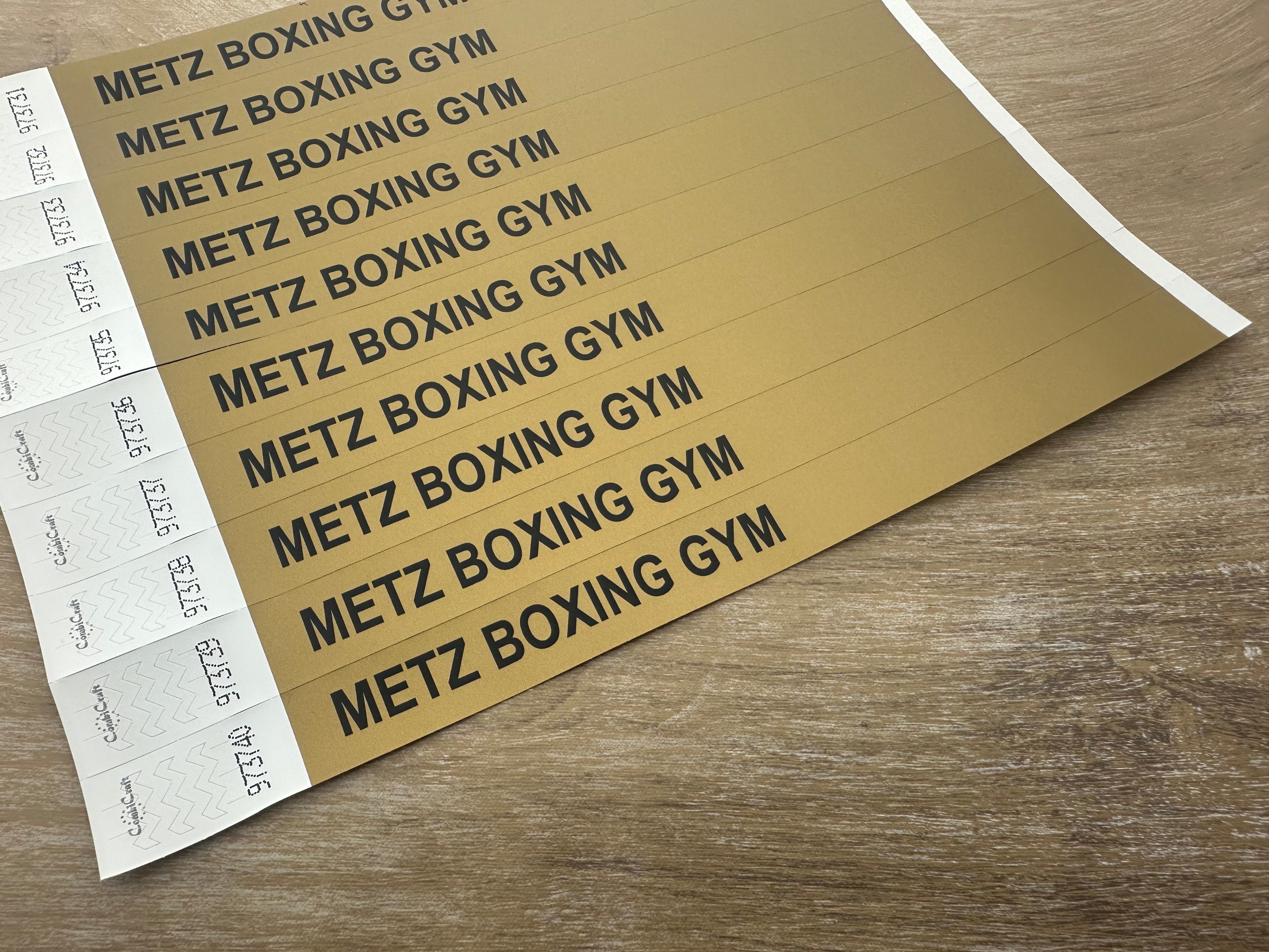 Personnalisez vos bracelets avec votre texte avec une impression en noir. Choisissez pour 1 ou 2 lignes de texte. Pour fêtes, événements ou festivals. Avec numérotation aléatoire et ruban adhésif. Vendus par 100 bracelets.
