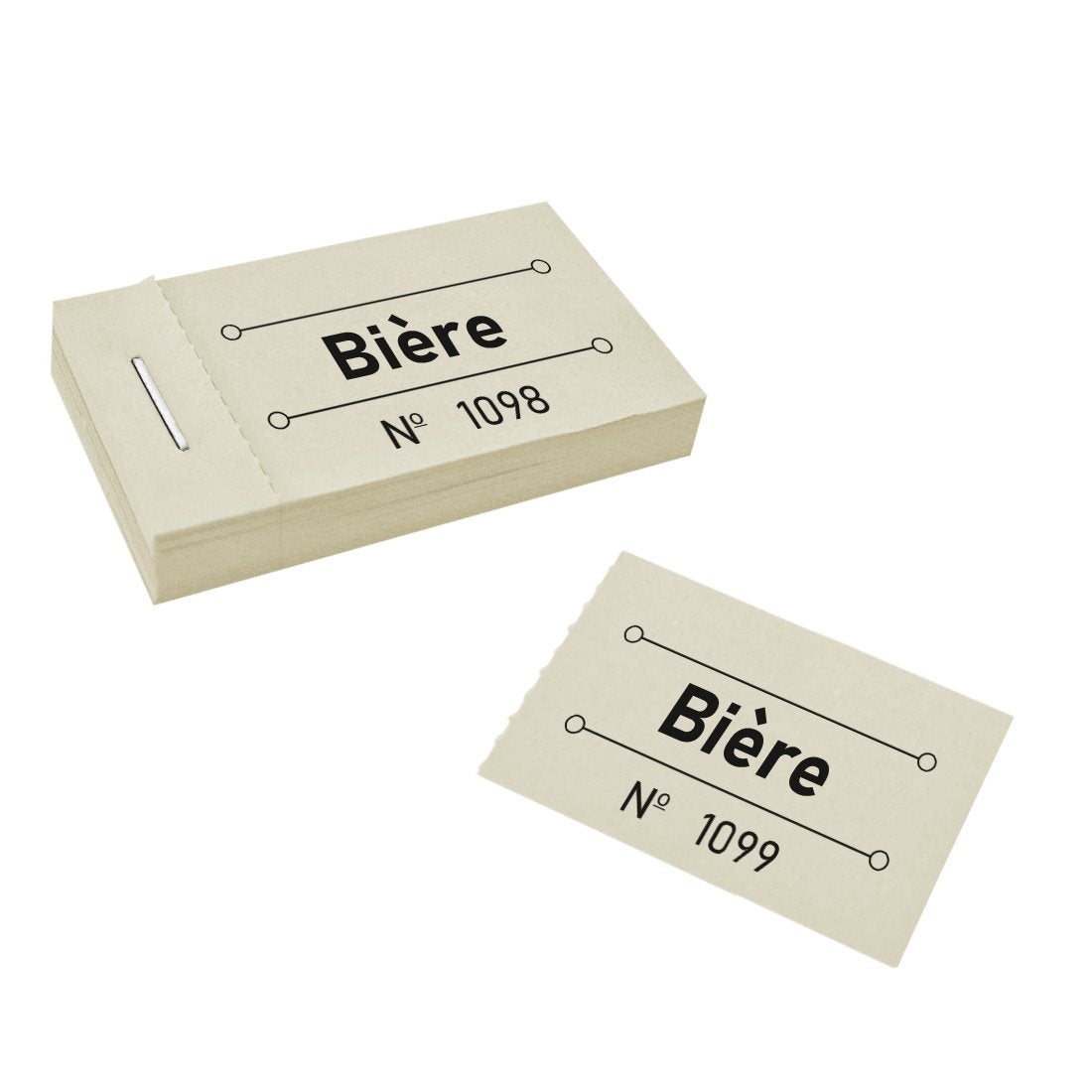 Ticket boisson en couleur jaune pastel avec texte "Bière" de 50 x 30 mm. Chaque ticket dispose d'un numéro unique pour un meilleur contrôle. Conçus pour donner aux visiteurs pour chercher leurs bières. Vendu par 50 tickets. En savoir plus