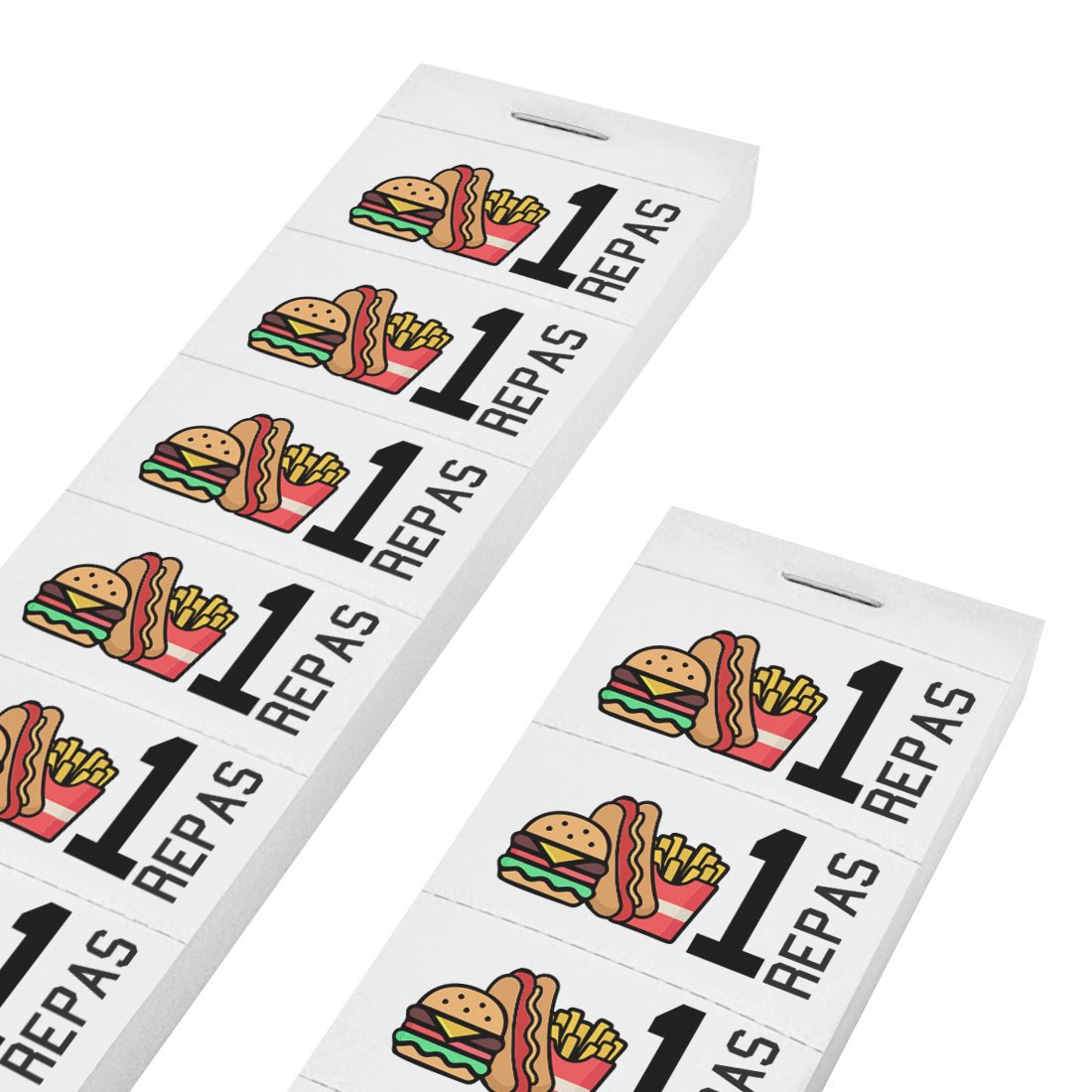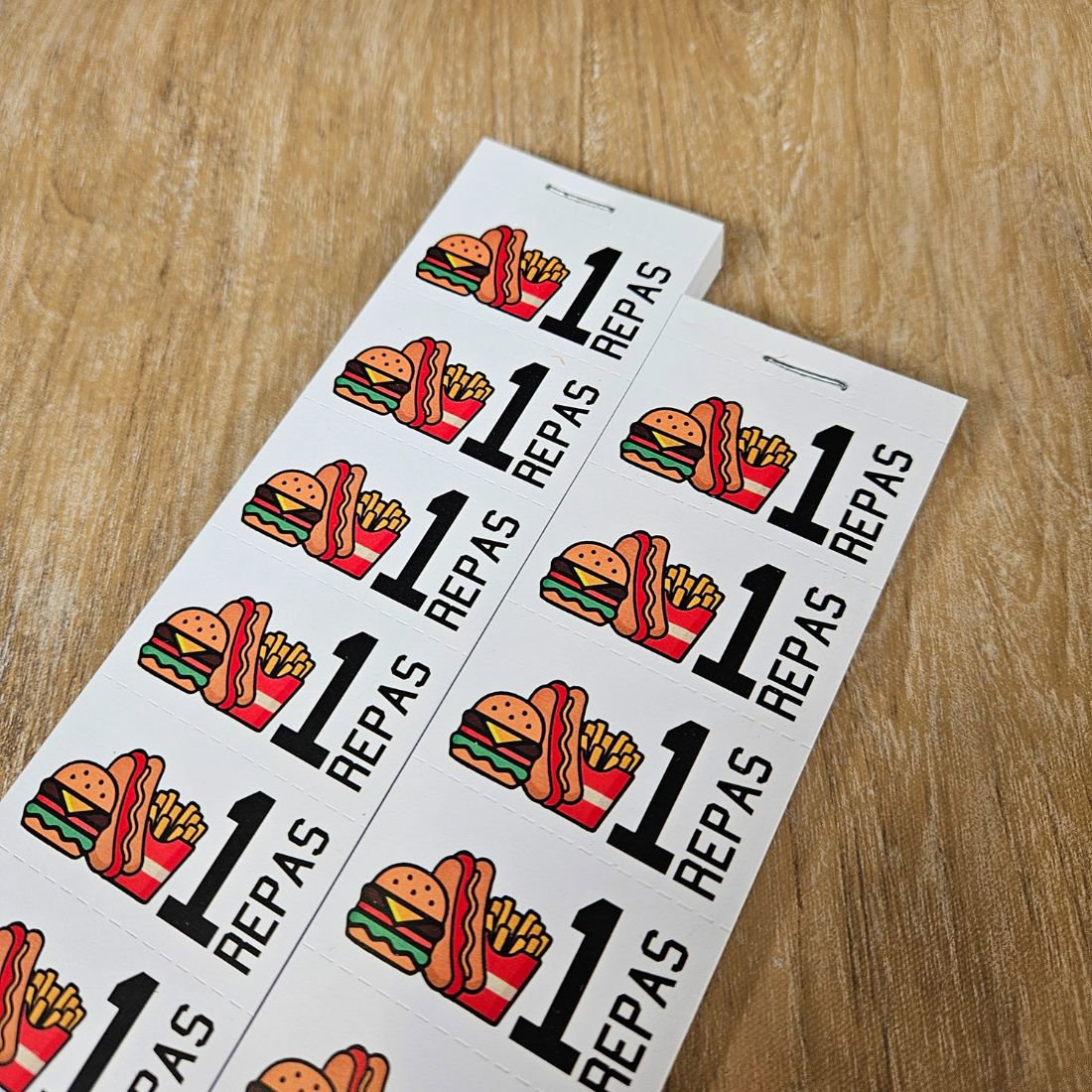 Les tickets boissons sont un moyen de paiement pratiques pour des fêtes, événements, apéros et autres occasions. Ils disposent du texte « 1 repas » avec icônes de plusieurs types de nourriture.