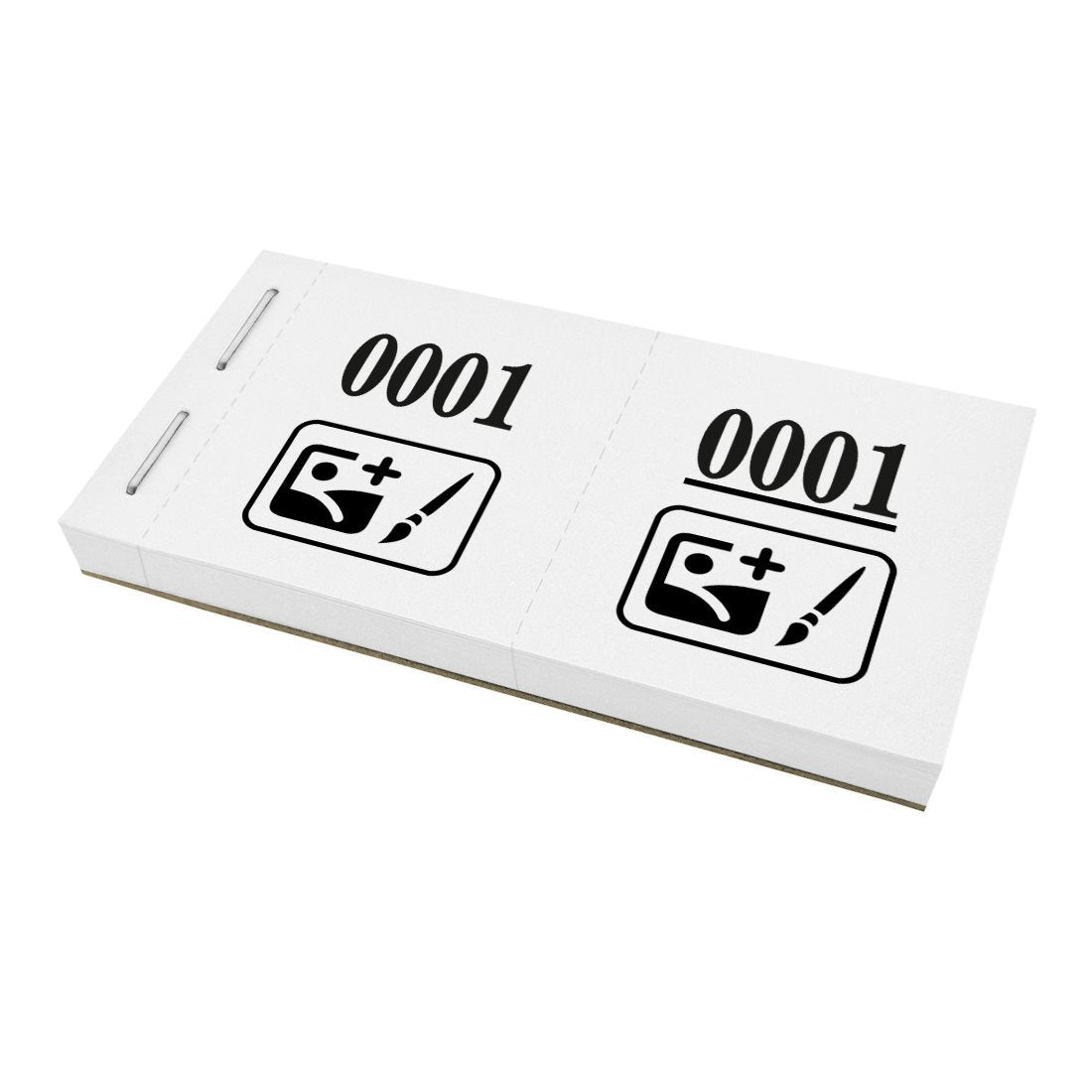Tickets de vestiaire à personnaliser dans un carnet. Idéal pour des théâtres, salles de concert, hôtels ou discothèques. Accrochez facilement les tickets à un manteau ou sac à main. Les numéros commencent à 0001 et se terminent aux doubles numéros que vous commandez. Avec perforation.