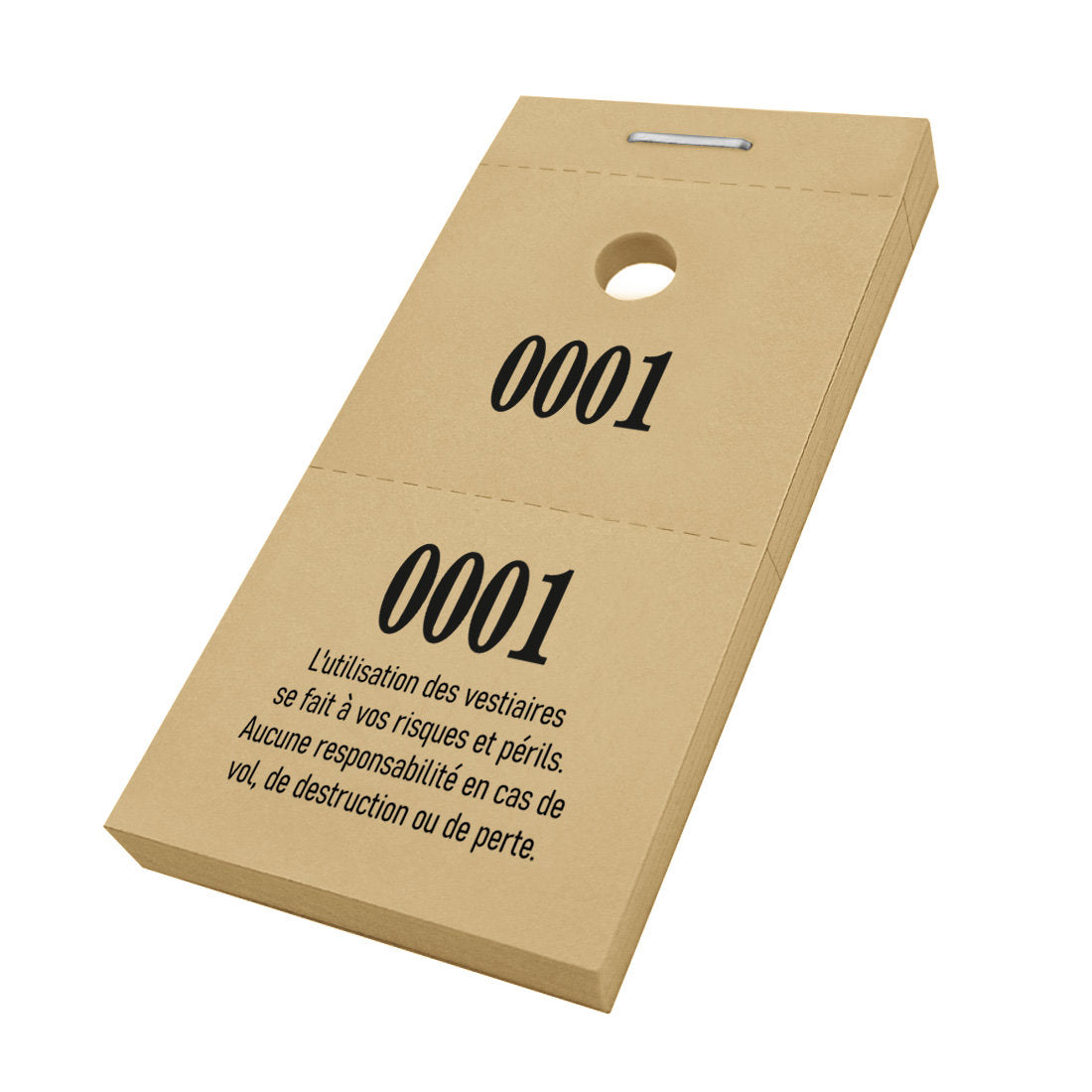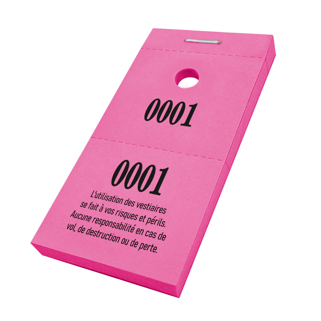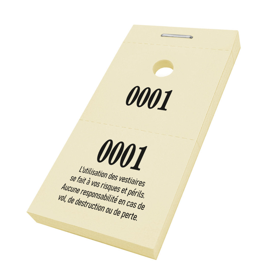 Carnet de tickets vestiaire avec trou pour cintres. Vous retrouvez sur le ticket, le texte que l'utilisation des vestiaires se fait à vos risques et périls, aucune responsabilité en cas de vol, de destruction ou de perte. Les tickets ont une numérotation commençant à partir de 0001 jusqu'au numéro commandé. Vendus par 1000 tickets.