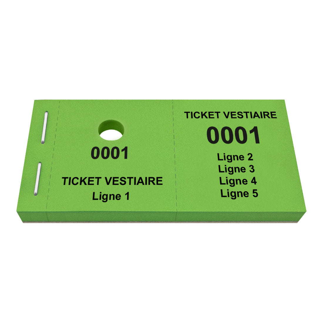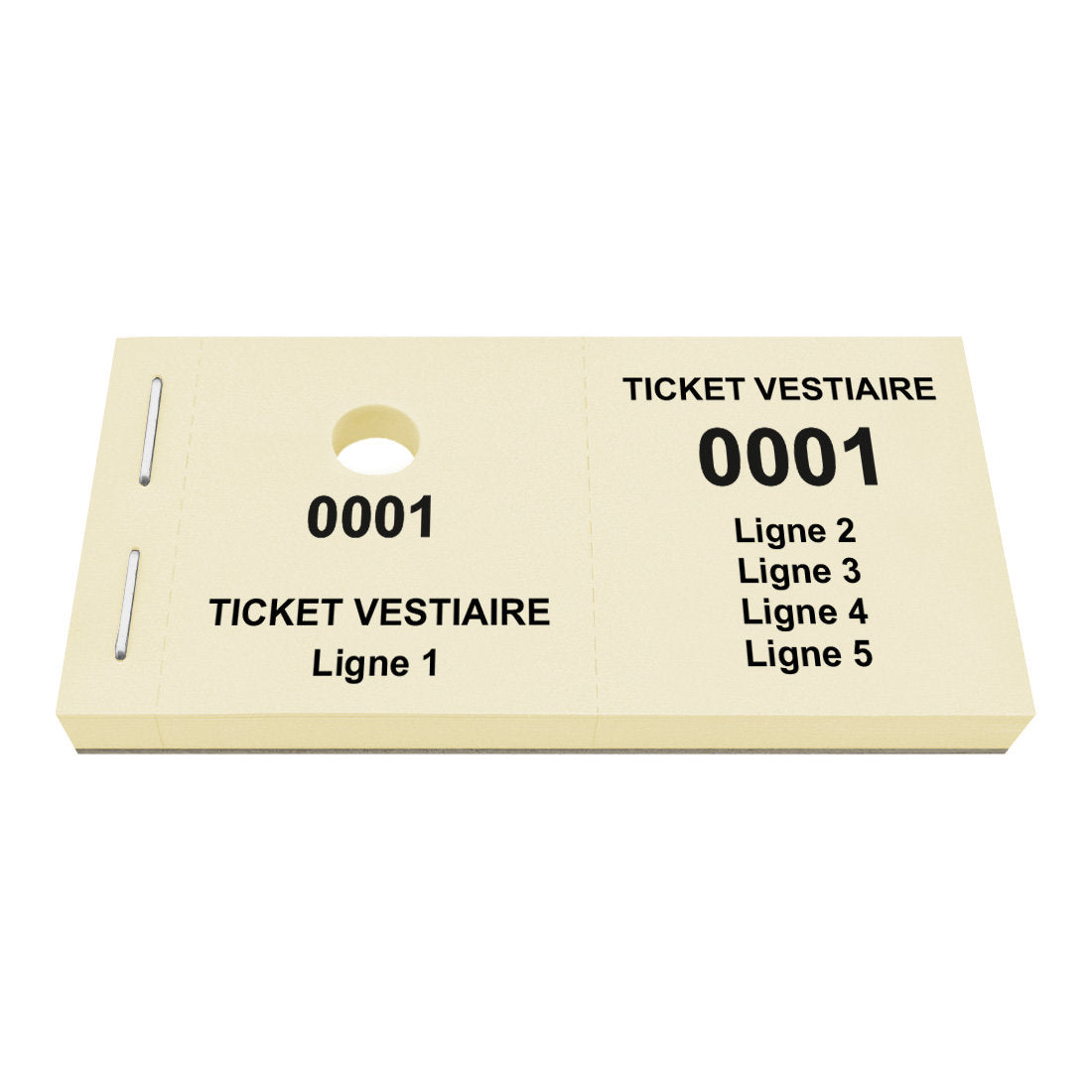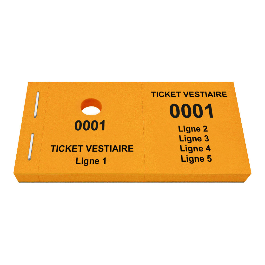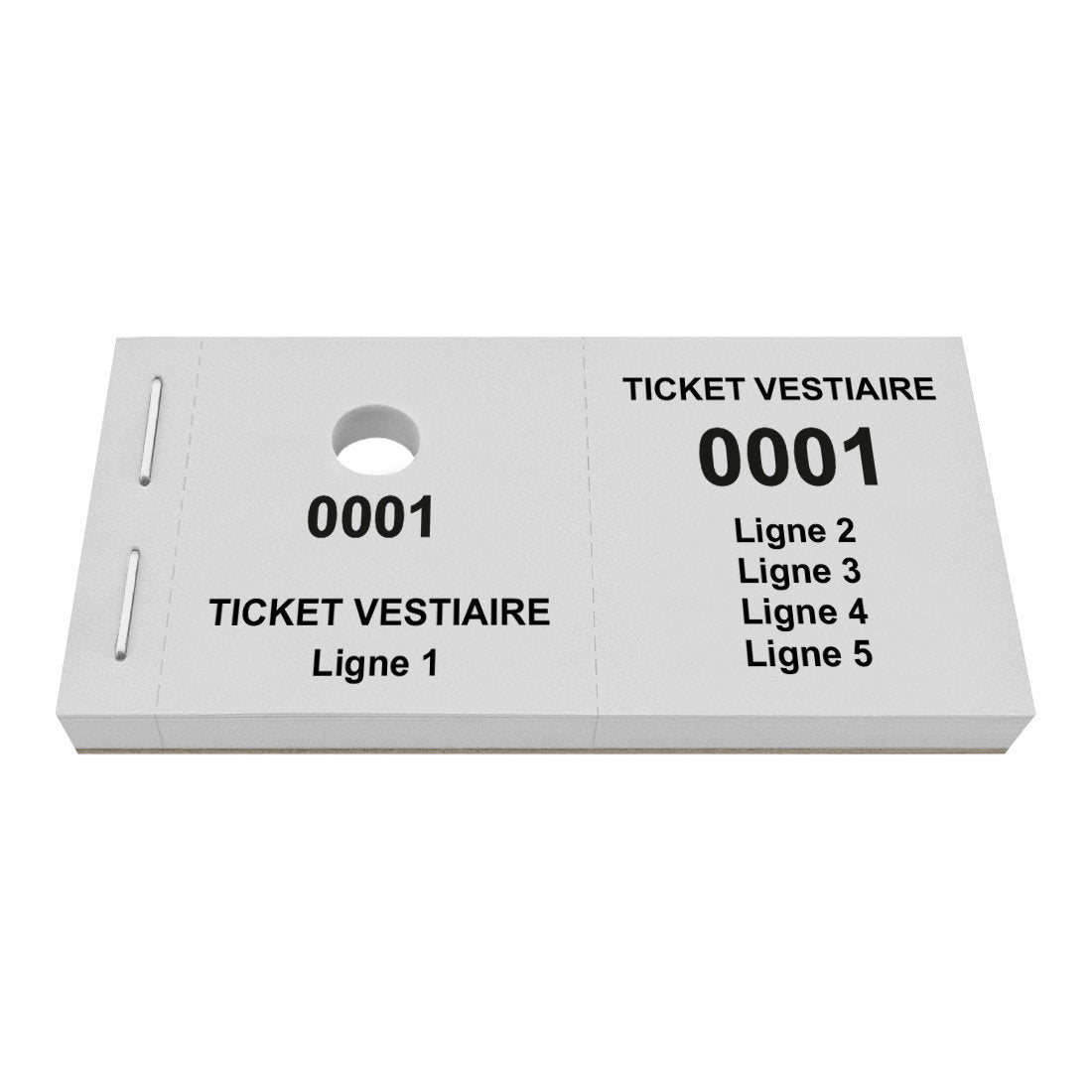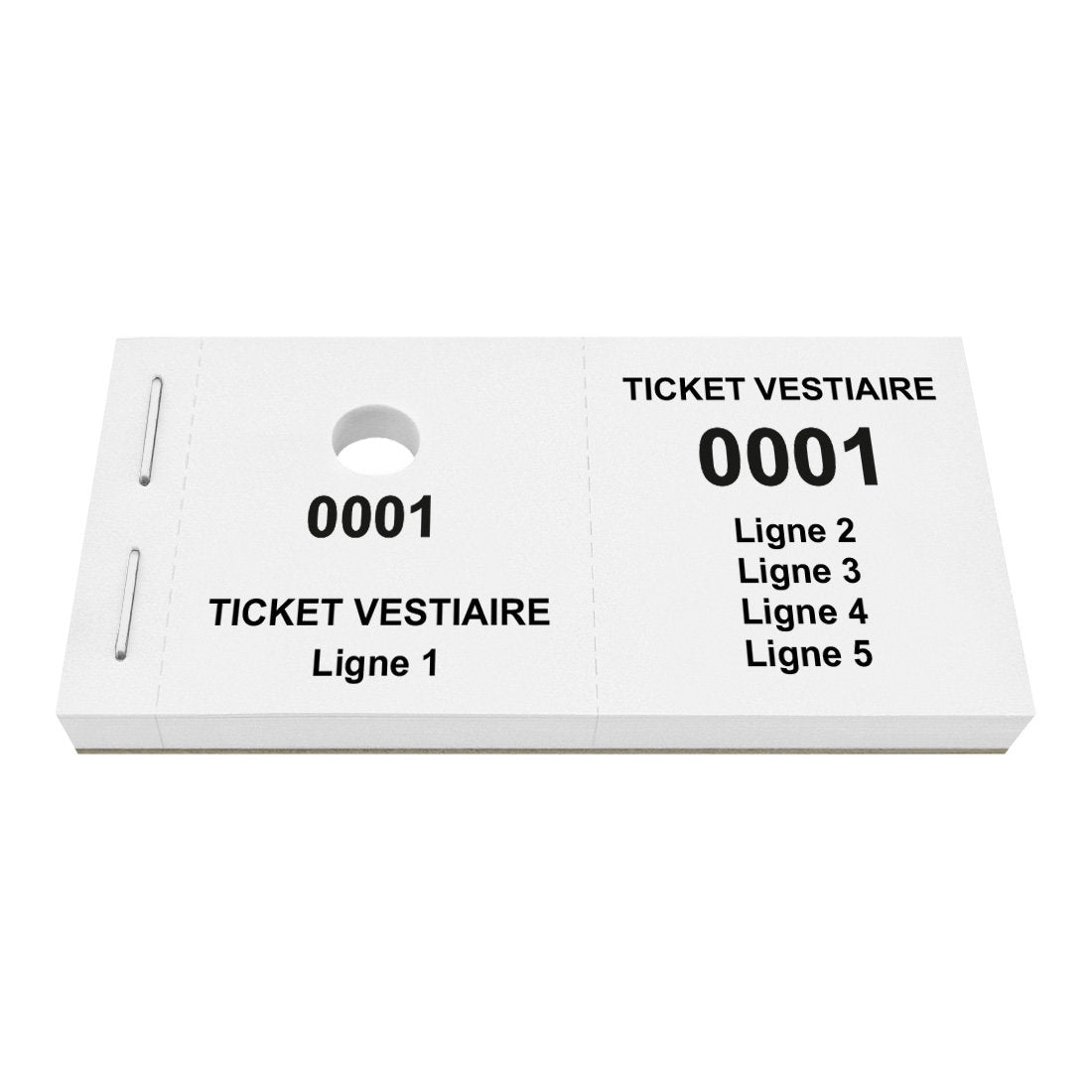 Carnet de tickets vestiaire avec propre texte avec 5 lignes avec trou pour cintres. Écrivez votre propre texte sur 5 lignes. Les tickets ont une numérotation commençant à partir 0001. Vendus par 1000 tickets.