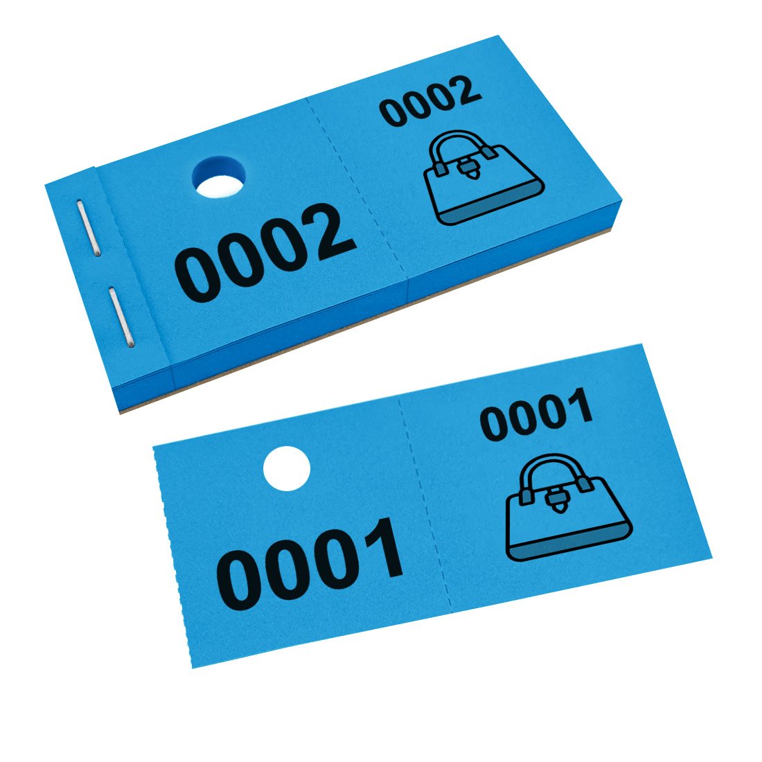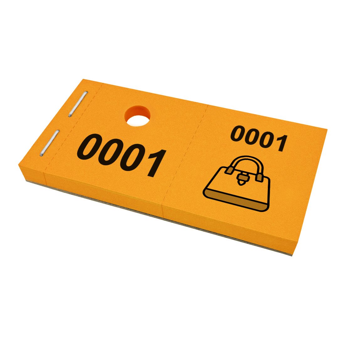 Carnet de tickets vestiaire avec trou pour cintres avec un symbole d'un sac à main. Les tickets ont une numérotation commençant à partir de 0001 jusqu'au numéro commandé. Vendus par 1000 tickets.