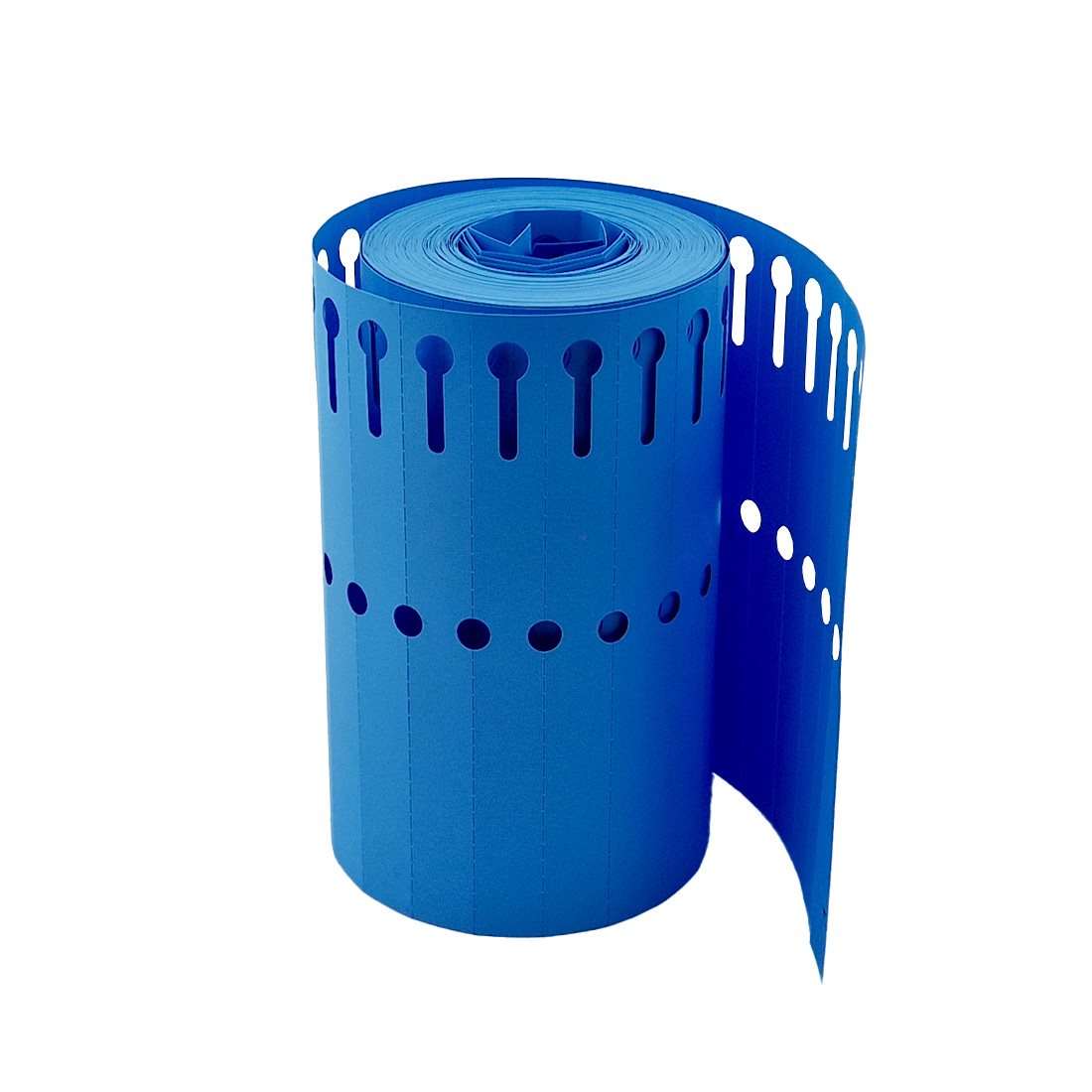 Étiquettes bleues à boucle sur feuilles pour jardinerie et autres secteurs. Les 1000 étiquettes de 120 x 13 mm sont sur un rouleau et ont une épaisseur de 200 microns. Possible d'écrire avec un stylo ou marqueur indélébile, mais aussi autocollants.