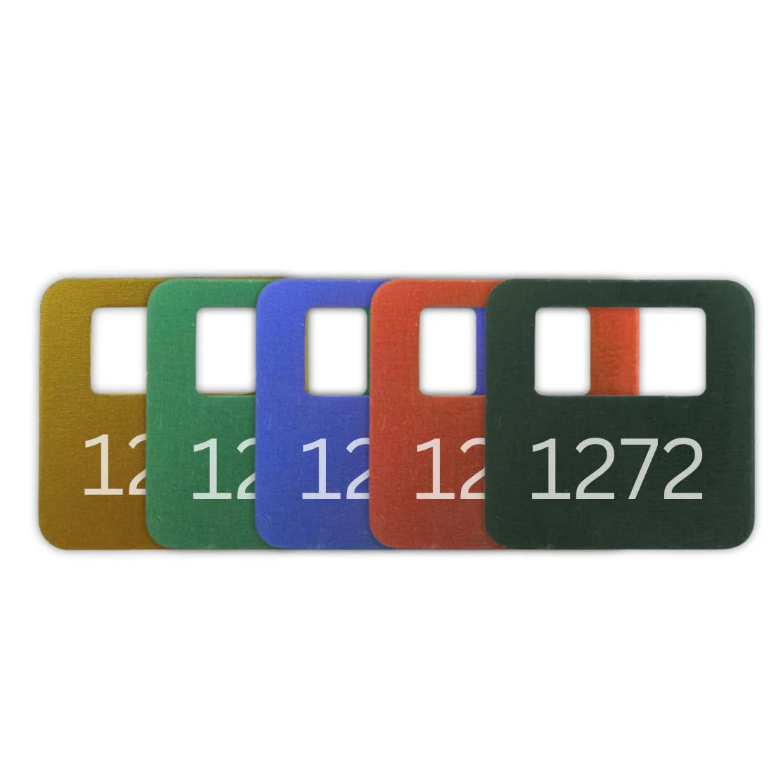 Jeton vestiaire numéroté en aluminium. Les jetons ont une dimension de 35 x 35 mm et ont une fixation au milieu de 21 x 11 mm. Disponible en plusieurs couleurs.