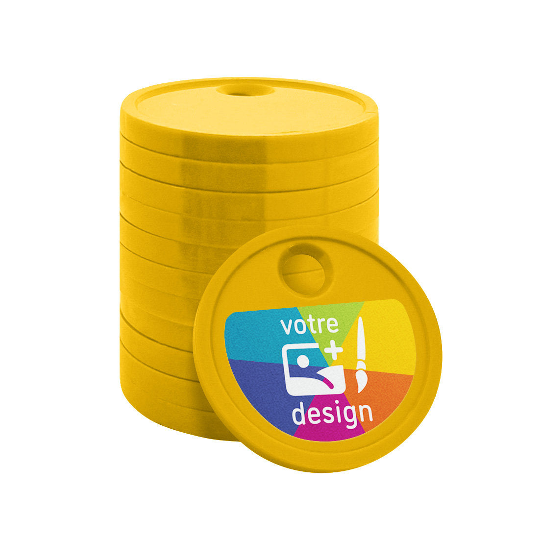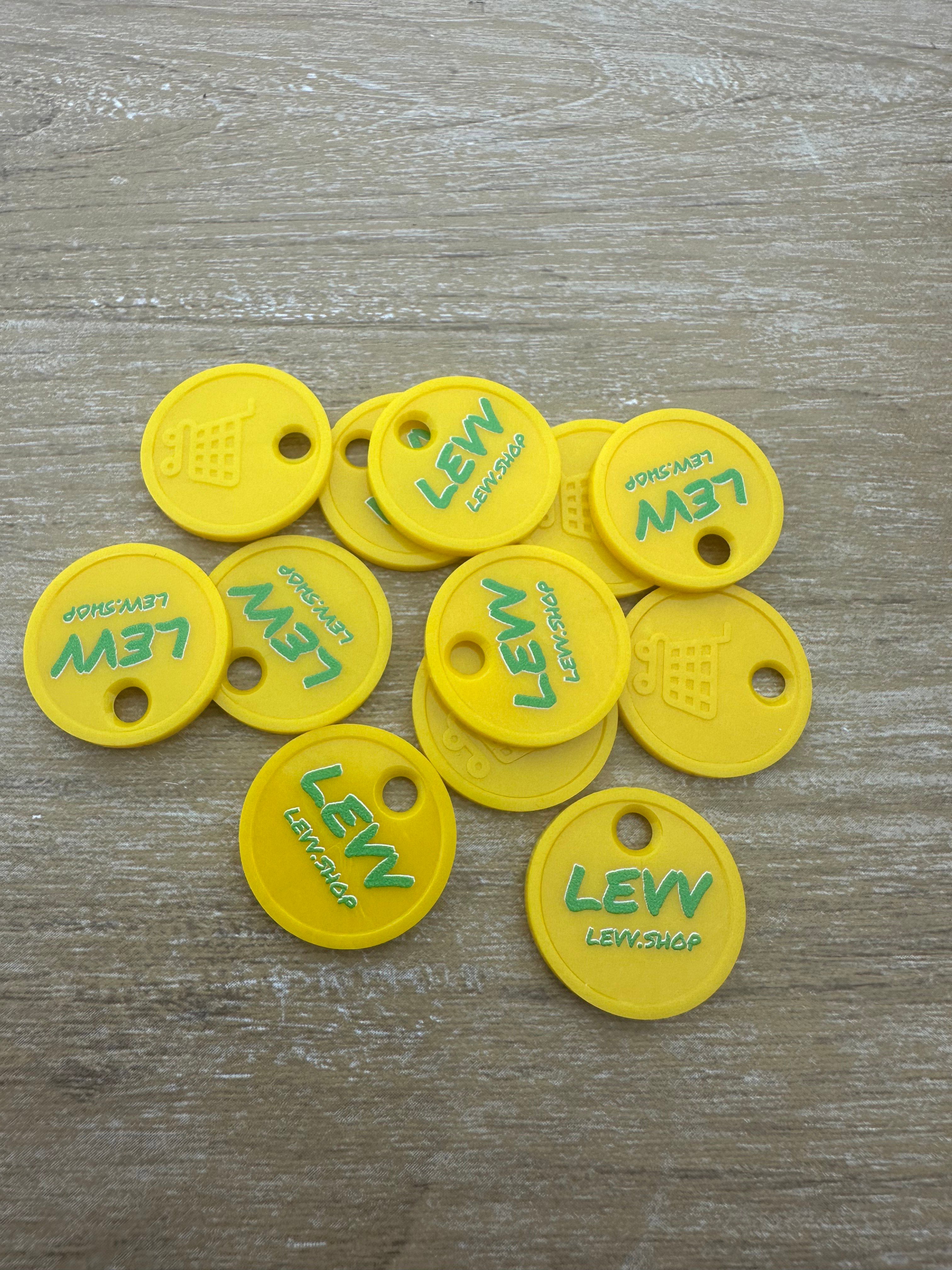 Équipez-vous de jetons caddie personnalisés pour chaque occasion ! Ces jetons caddie avec un diamètre de 24 mm (format 0,50 €) et d'une épaisseur d'environ de 2,10 mm sont vendus par 100 pièces. En savoir plus