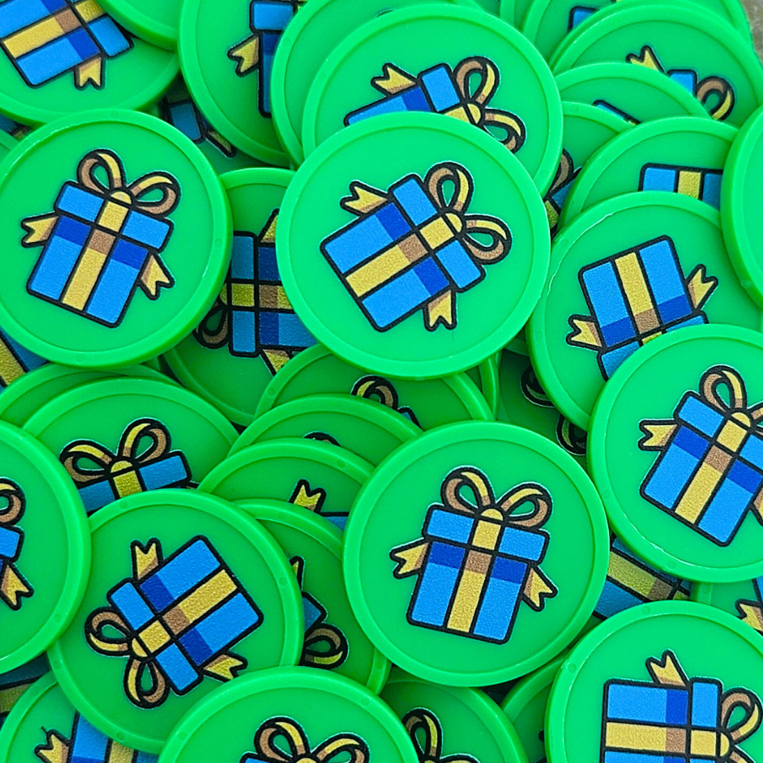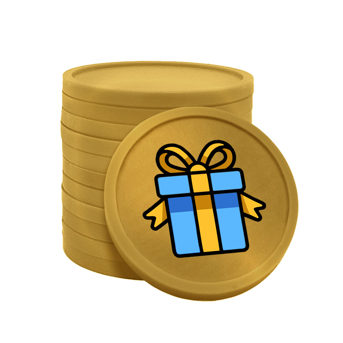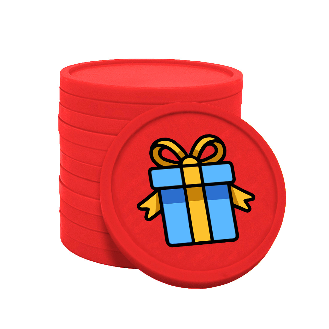 Découvrez les jetons pour buvette de CombiCraft avec une impression d'un cadeau. Chaque jeton dispose d'un diamètre de 29 mm avec une épaisseur d'environ de 2,35 mm. Ces jetons sont très pratiques lors d'un paiement à la buvette ou au stand de boisson.
