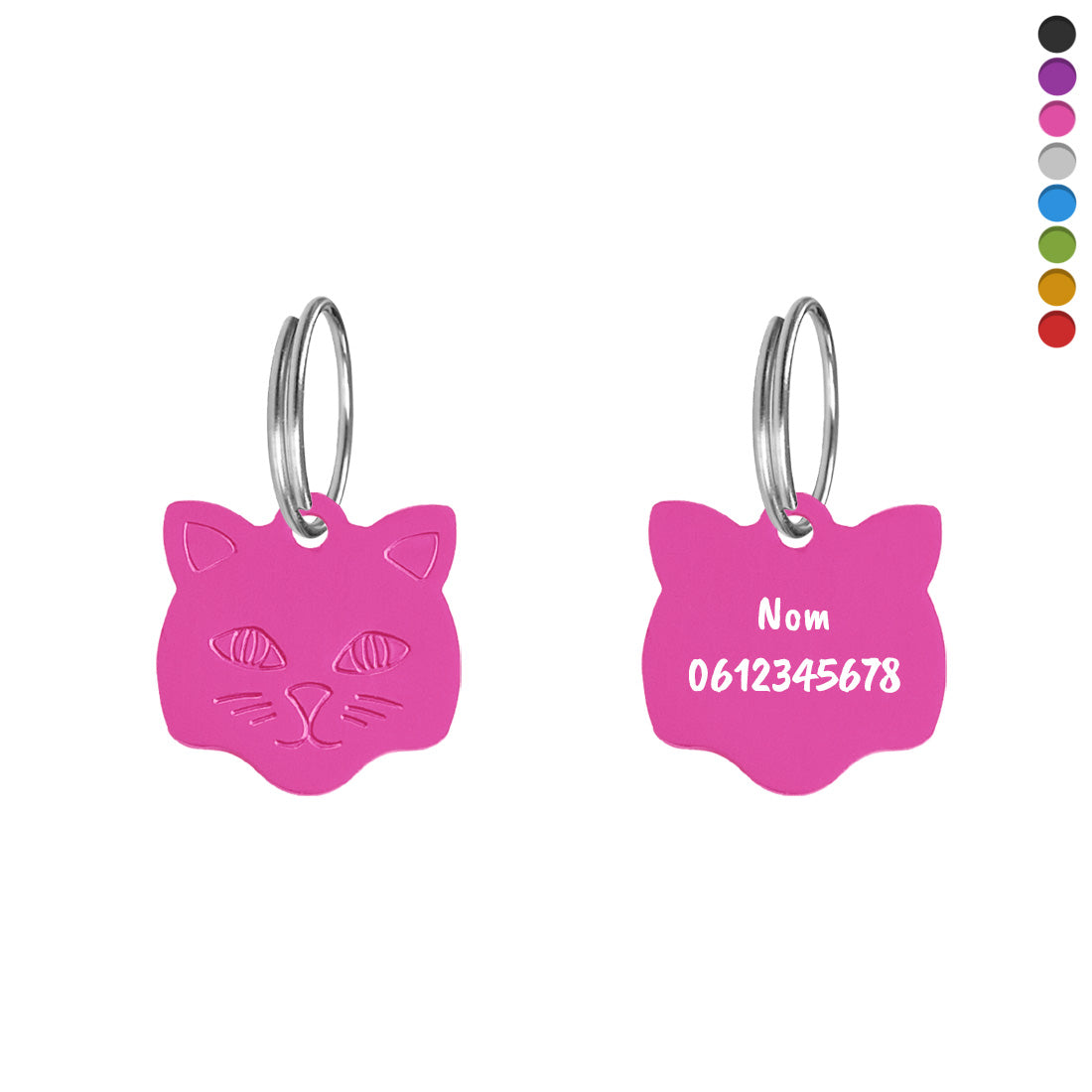Médaille pour chat personnalisée, mesurant 23 x 23 mm. Le nom et votre texte sont gravés au verso de la médaille pour identifier facilement votre chat. Personnalisez cette médaille sur deux lignes de texte. Vendue à l'unité, incluant un anneau brisé de Ø18 mm .