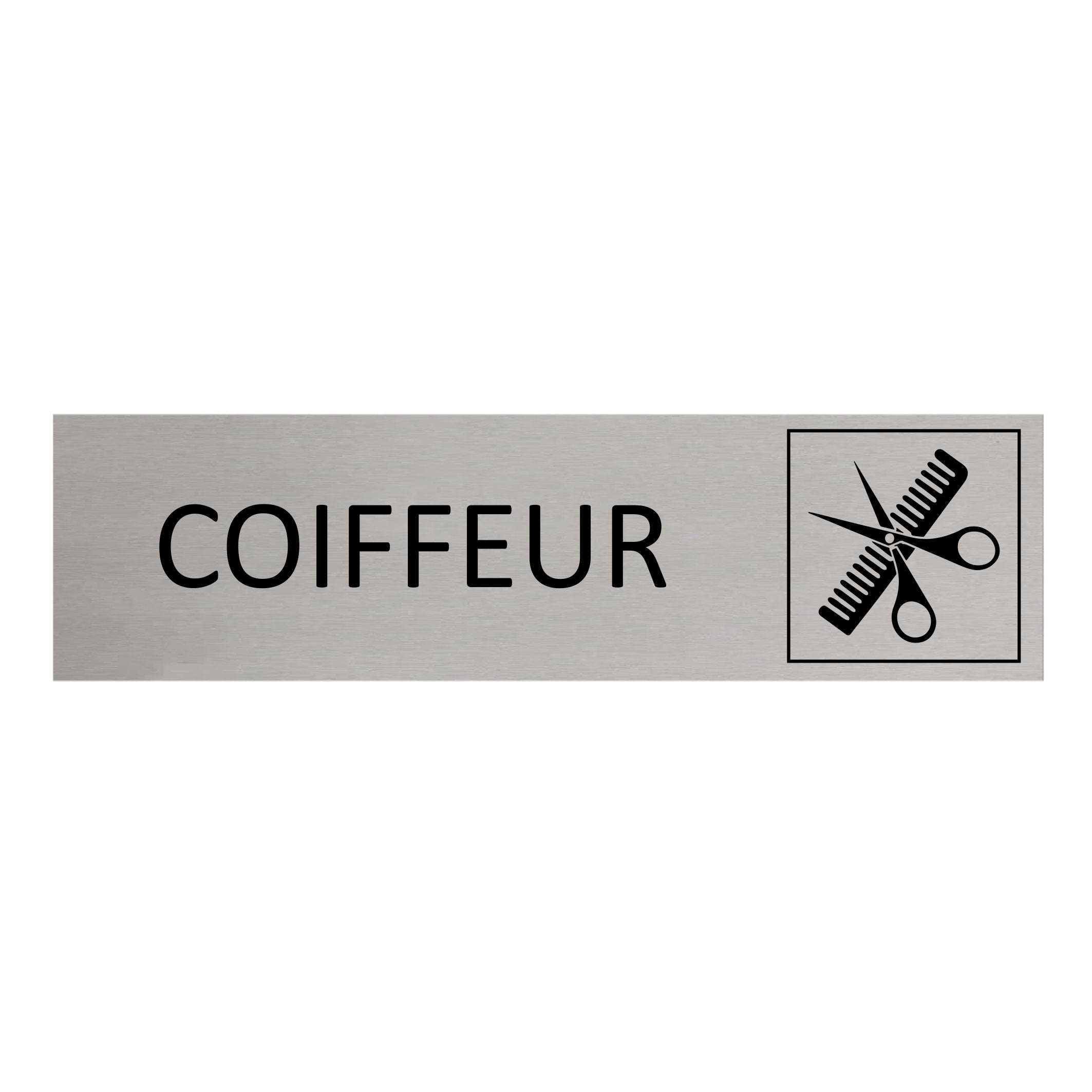Plaque de porte en aluminium Coiffeur avec ruban adhésif à l’arrière. La plaque mesure 165 x 45 mm et a une épaisseur de 0,5 mm. À installer à l’intérieur comme à l’extérieur.