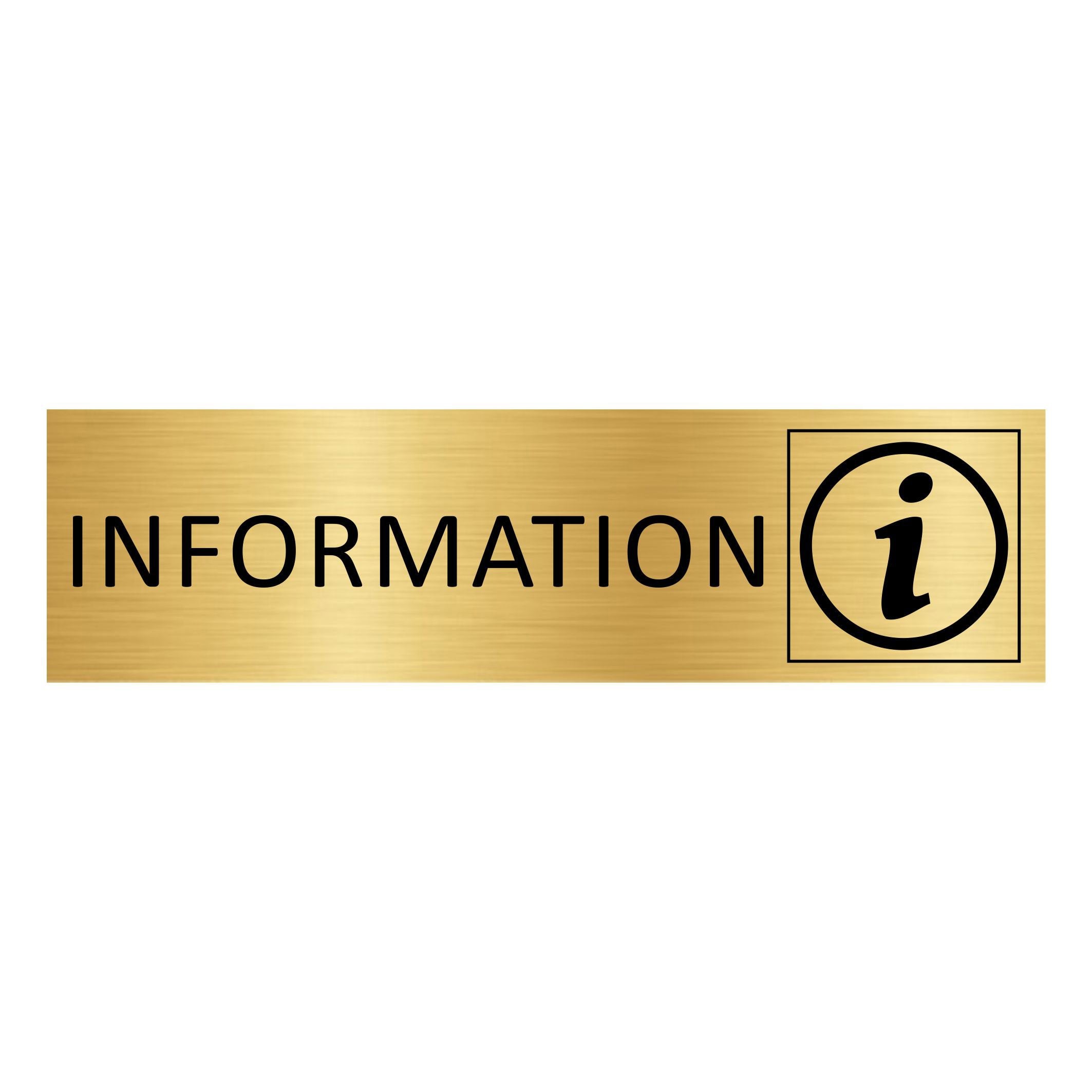 Plaque de porte en aluminium doré Information avec ruban adhésif à l’arrière. La plaque mesure 165 x 45 mm et a une épaisseur de 0,5 mm. À installer à l’intérieur comme à l’extérieur.
