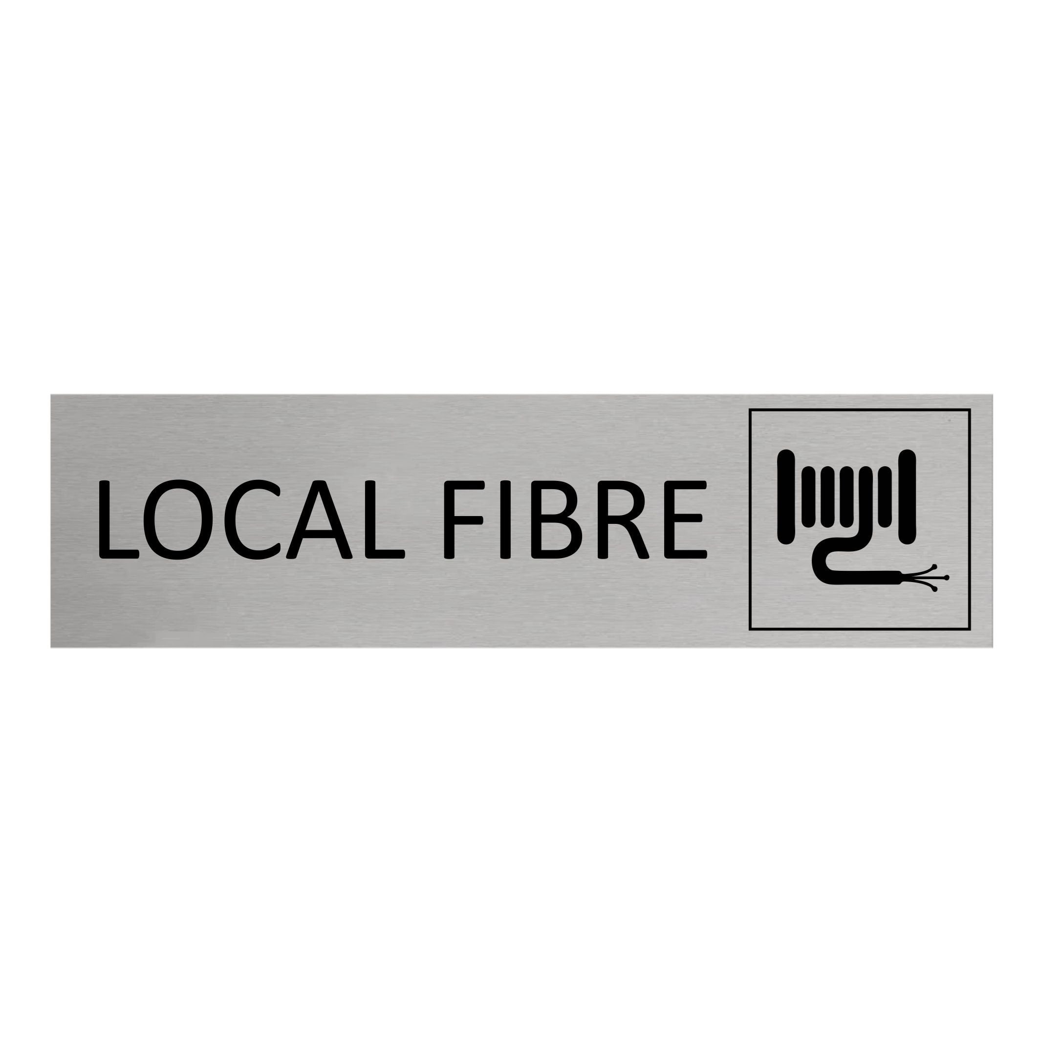 Plaque de porte en aluminium Local fibre avec ruban adhésif à l’arrière. La plaque mesure 165 x 45 mm et a une épaisseur de 0,5 mm. À installer à l’intérieur comme à l’extérieur.