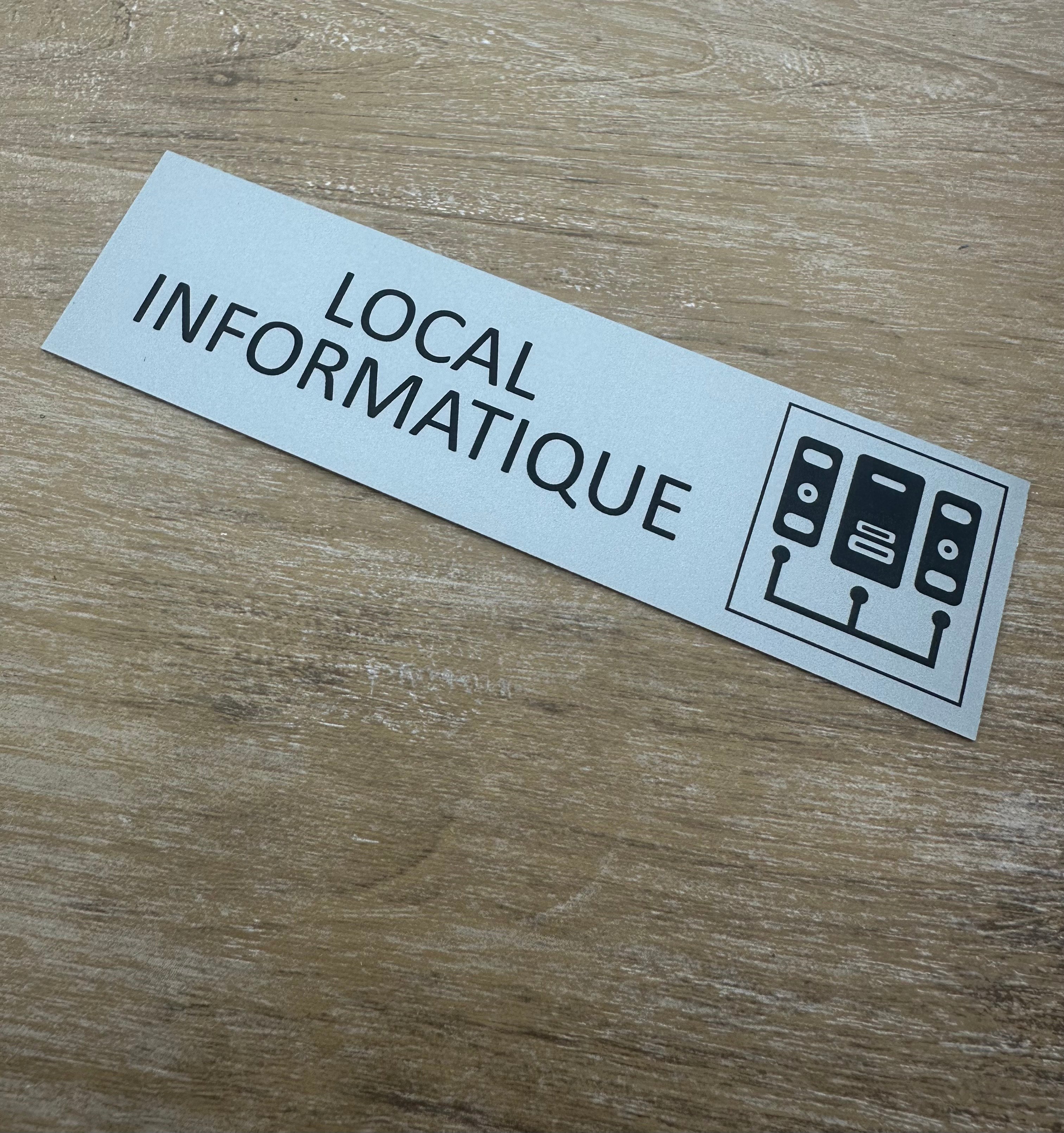 Plaque de porte en aluminium local Informatique avec ruban adhésif à l’arrière. La plaque mesure 165 x 45 mm et a une épaisseur de 0,5 mm. À installer à l’intérieur comme à l’extérieur. En savoir plus