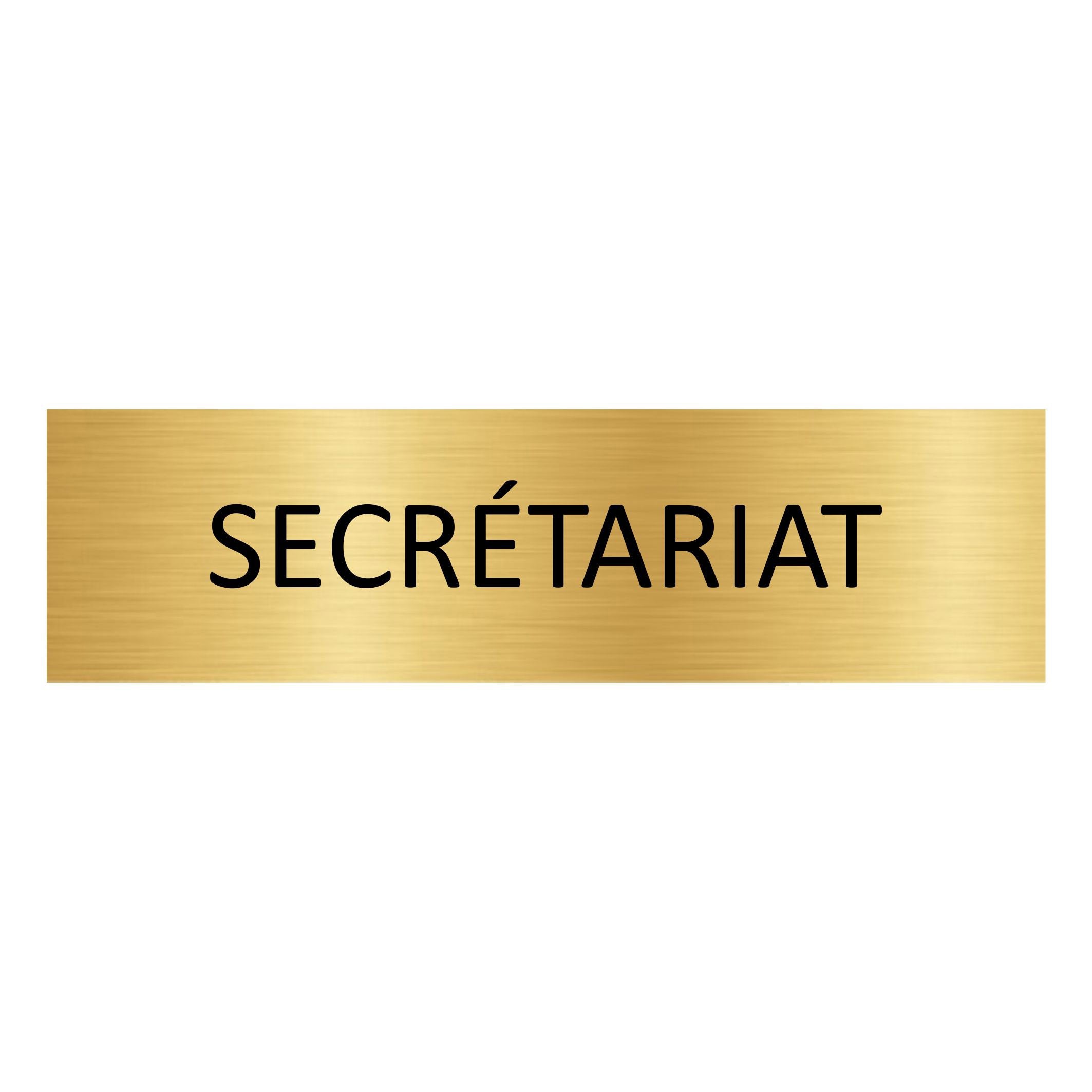 Plaque de porte en aluminium doré Secrétariat avec ruban adhésif à l’arrière. La plaque mesure 165 x 45 mm et a une épaisseur de 0,5 mm. À installer à l’intérieur comme à l’extérieur.