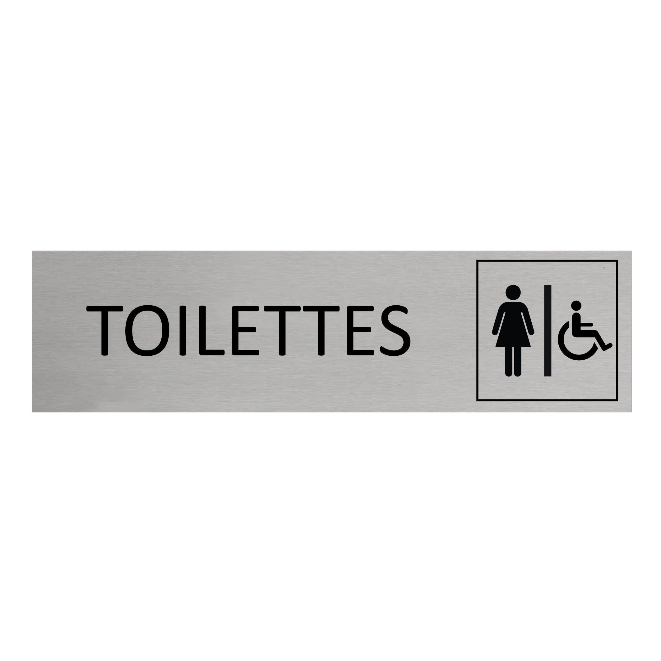 Plaque de porte en aluminium Toilettes femmes & accessibles avec ruban adhésif à l’arrière. La plaque mesure 165 x 45 mm et a une épaisseur de 0,5 mm. À installer à l’intérieur comme à l’extérieur.
