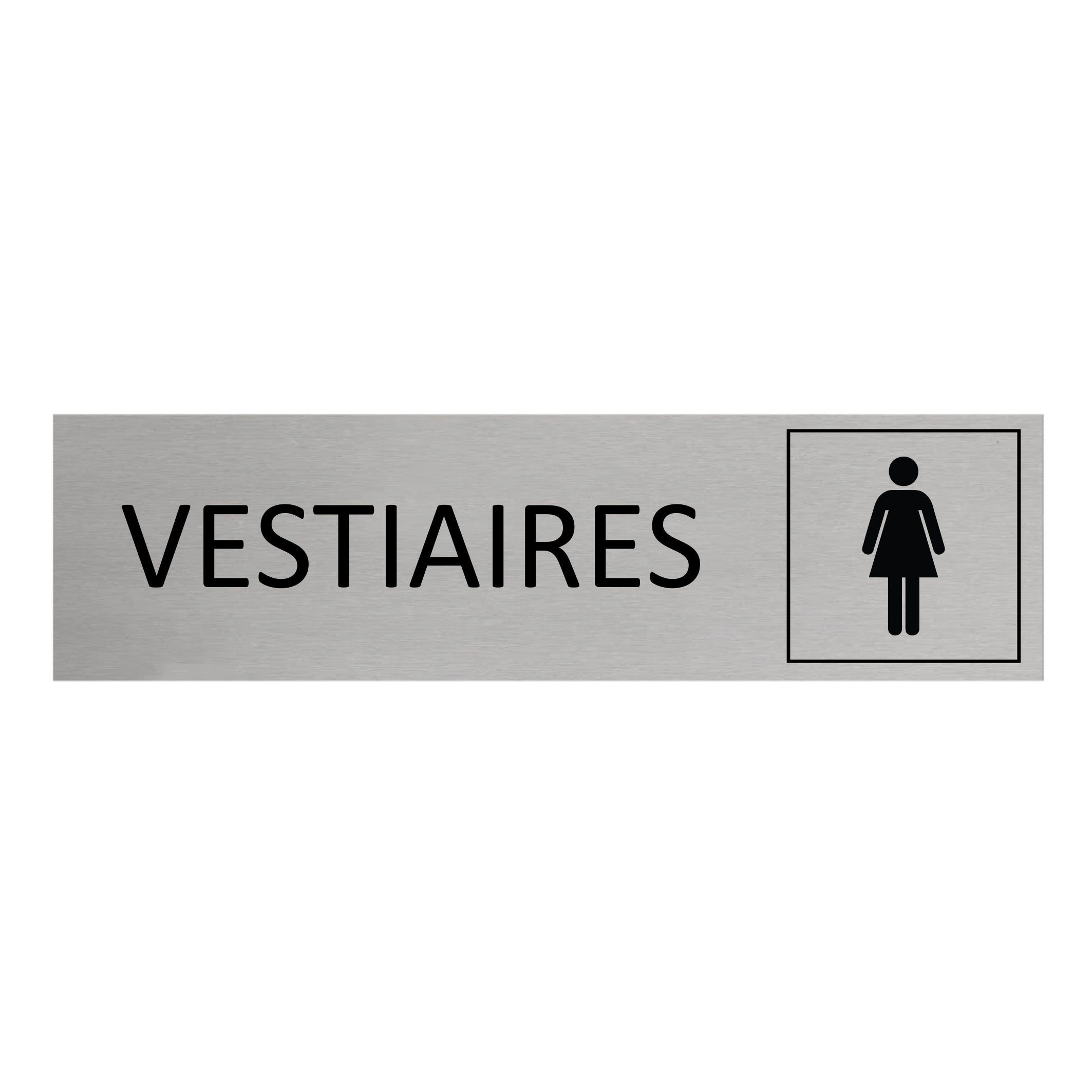 Plaque de porte en aluminium Vestiaires femmes avec ruban adhésif à l’arrière. La plaque mesure 165 x 45 mm et a une épaisseur de 0,5 mm. À installer à l’intérieur comme à l’extérieur. En savoir plus