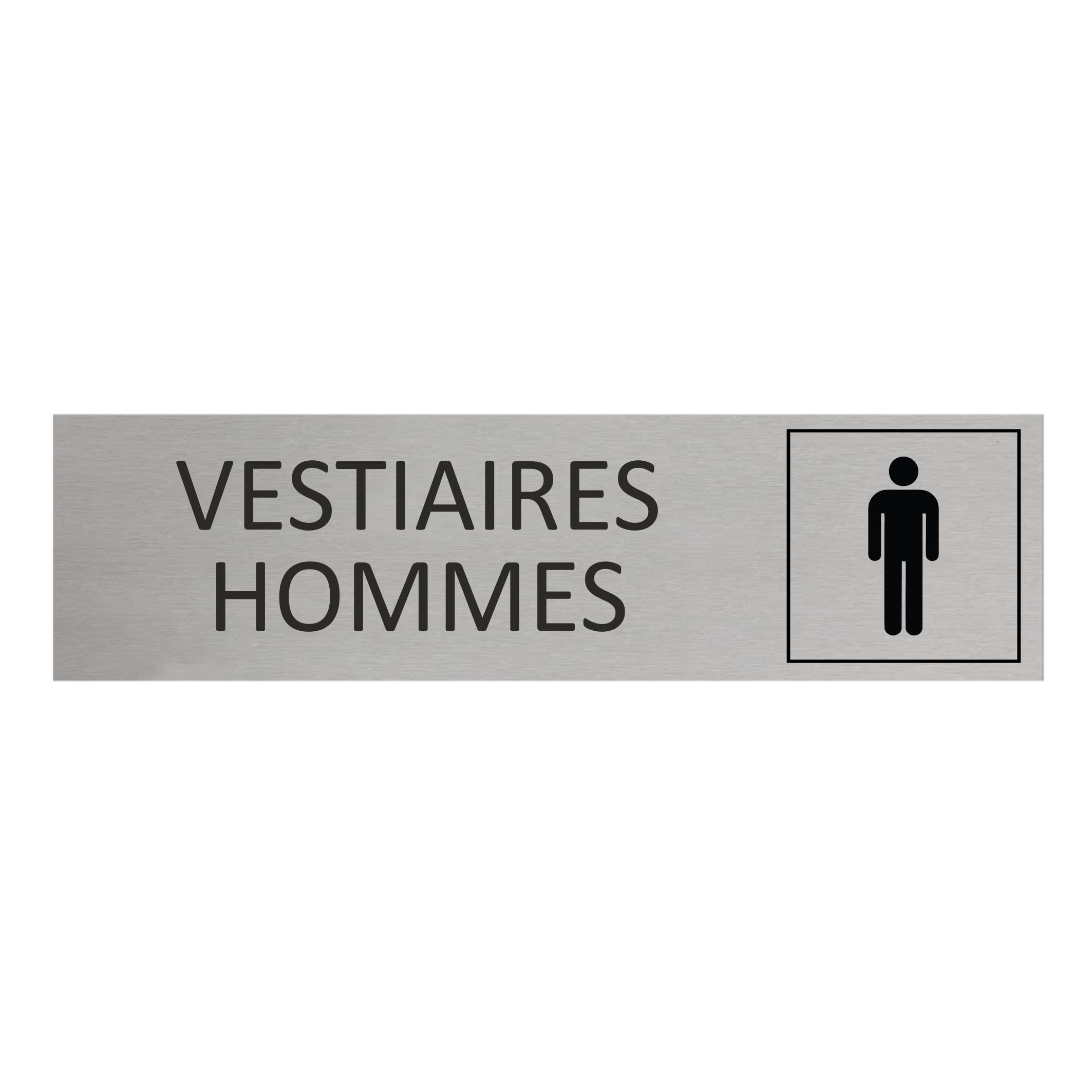 Plaque de porte en aluminium Vestiaires hommes avec ruban adhésif à l’arrière. La plaque mesure 165 x 45 mm et a une épaisseur de 0,5 mm. À installer à l’intérieur comme à l’extérieur. En savoir plus