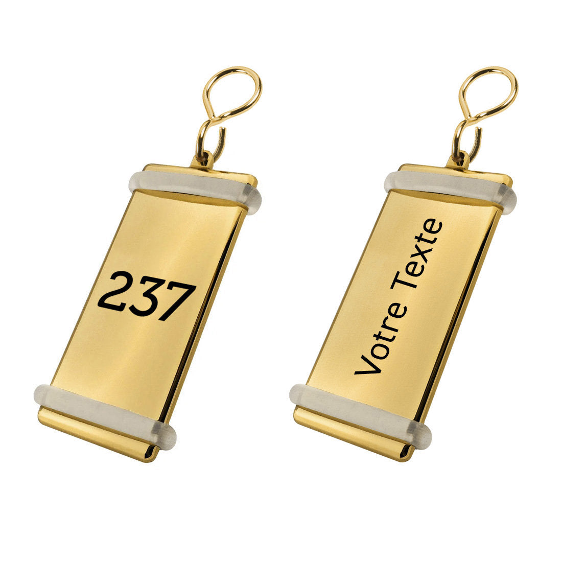 Personnalisez le porte-clés d'hôtel Montparnasse en laiton. Ajoutez un texte, numéros, ou logo qui convient à votre établissement. Le Montparnasse est équipé d'une protection en caoutchouc transparent en haut et en bas. Dimension de 77 x 33 mm.