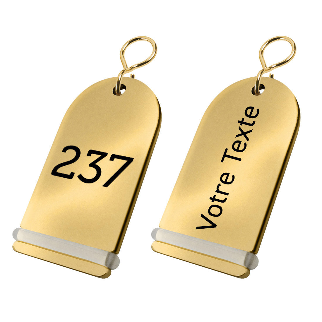 Personnalisez le porte-clés d'hôtel Pigalle en laiton. Ajoutez un texte, numéros, ou logo qui convient à votre établissement. Le Pigalle est équipé d'une protection en caoutchouc transparent en bas. Dimension de 85 x 45 mm.