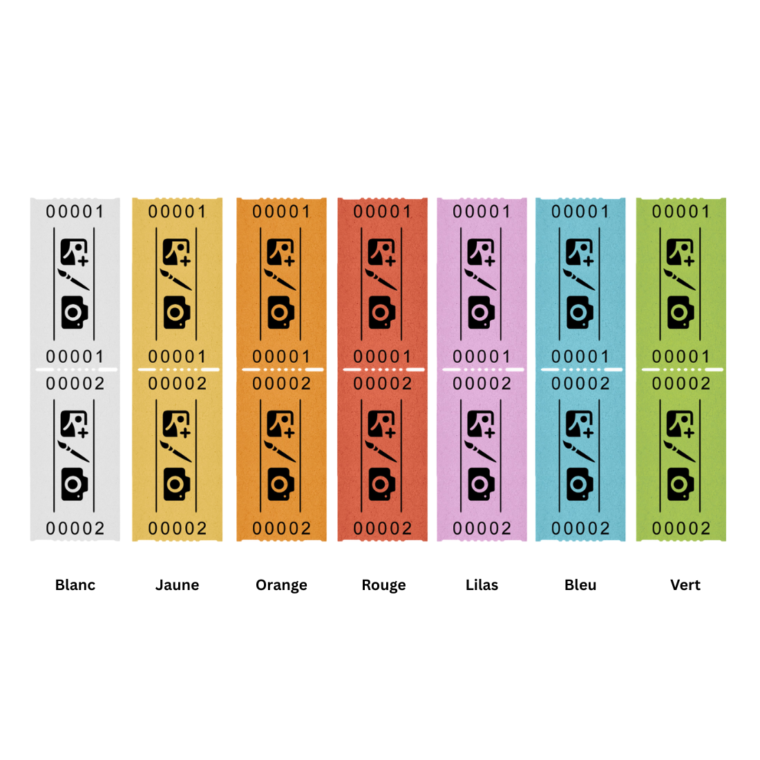 Rouleau avec tickets d'entrée personnalisés en différentes couleurs - 80 x 30 mm - 1000 tickets