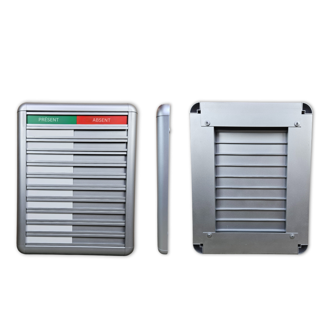 Tableau de présence et d’absence CombiCraft pour 10 personnes avec texte ‘Présent-Absent’, en aluminium avec 10 étiquettes coulissantes. Dimension de 257 x 330 mm.