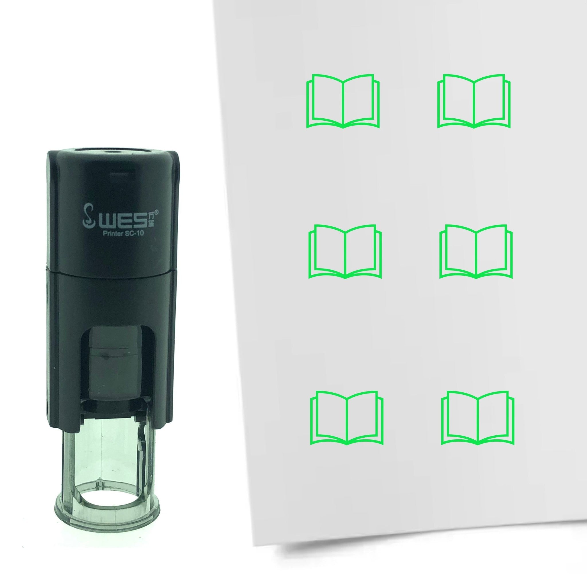 Tampon encreur avec motif livre ouvert de 1 cm rond. Six couleurs de disponibles. Vous pouvez utiliser ce tampon encreur pour des cartes de collection ou des cartes de fidélité. Le tampon encreur dispose d'une cassette d'encrage interne.